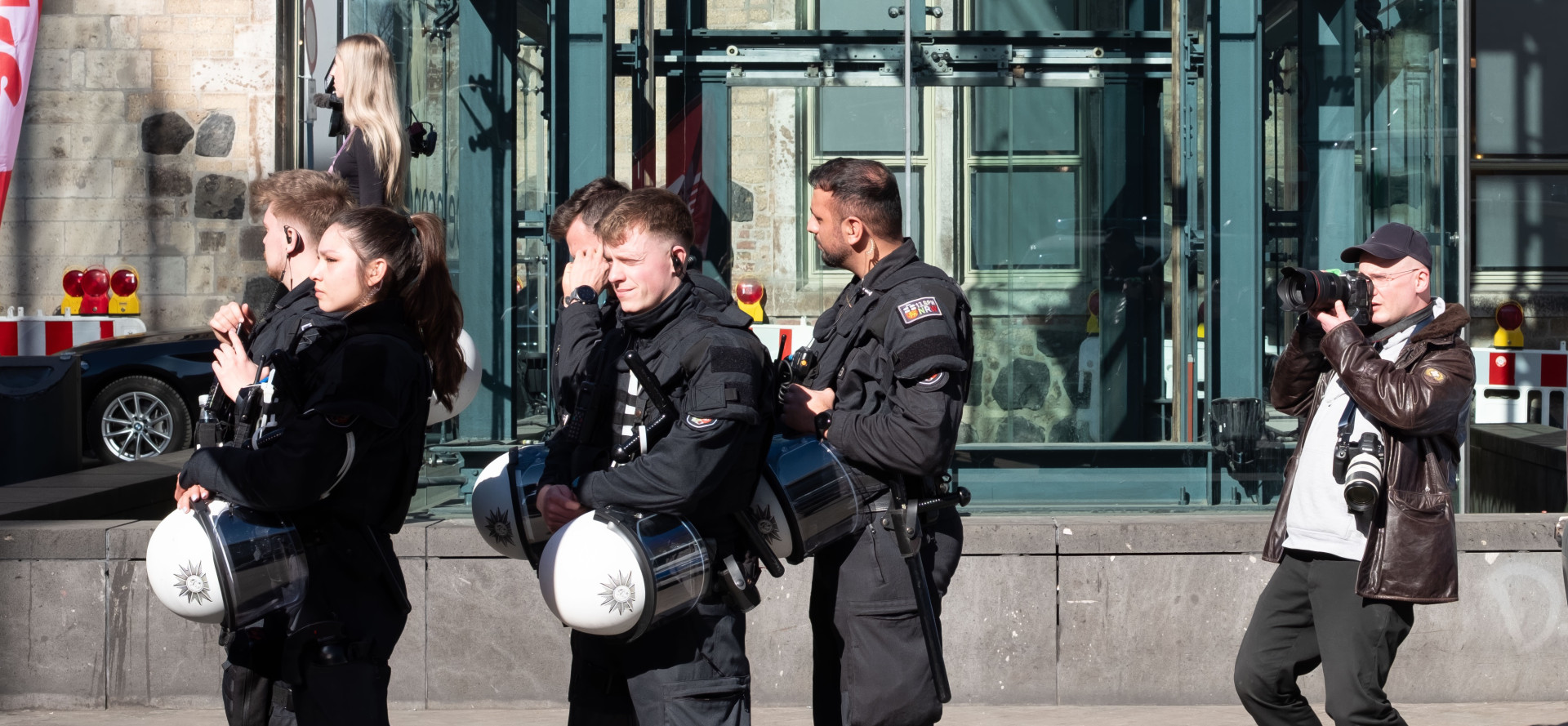 Alexander Supp | February 9, 2026Google-KI sagt am 9.2.2026: Das Bild zeigt eine Gruppe von Polizisten in dunklen Uniformen der Einsatzhundertschaft, die Helme vor dem Körper halten. Diese Beamten sind oft bei Demonstrationen oder Großlagen im Einsatz. Details zum Bildinhalt Polizeieinsatz: Die Beamten tragen typische Ausrüstung für den Ordnungsdienst, wie Schutzwesten und Funkgeräte. Die runden weißen Helme mit dem Polizeistern sind ein charakteristisches Merkmal deutscher Einsatzkräfte. Dokumentation: Am rechten Bildrand ist eine Person in Zivil mit einer professionellen Kamera zu sehen, die das Geschehen fotografiert. Hintergrund: Die Szene spielt sich vor einem modernen Gebäude mit Glasfassade ab. Im Hintergrund sind Absperrungen und Warnleuchten erkennbar, die auf eine abgesicherte Veranstaltungs- oder Demozone hindeuten. Das Bild könnte in einer Stadt wie Köln, Düsseldorf oder München aufgenommen worden sein, da diese Uniformen und Helmtypen dort bei verschiedenen Anlässen wie dem Jahrestag des Hamas-Terrors oder anderen politischen Versammlungen häufig zu sehen sind. Möchtest du mehr über die Kennzeichnung auf den Uniformen oder die spezifischen Ausrüstungsgegenstände der Beamten erfahren?20250305 2025030520250305
